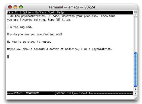 Doctor. It was very funny at first because the program seems to understand everything that means we speak, in reality we humans believe that the machine understands us, that the other side is an intelligent interlocutor. always been a technical desire to believe that a machine can have enough intelligence to respond with logic and practical test questions to be delivered. An interesting example is the computer Seth Brundle: