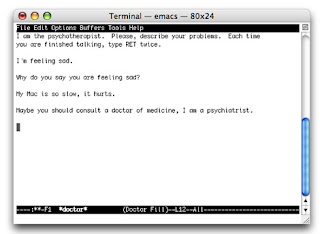 ... Can machines excel to the point that they become consultants? Apparently yes. The fact of living in the world of 2010 that is controlled by computers "not so smart" shows dependence of our daily activities. If the machine is able to formulate practical advice based on the analysis of a vast network of databases contained in the world, is unlikely to achieve an argument that contradicts reason. Maybe people eventually tired of the treachery and sincere friendships, search for these beings to protect his solitude, a solitude more bearable if you make the other person on the other side as the "alter ego." ELIZA code in JavaScript.